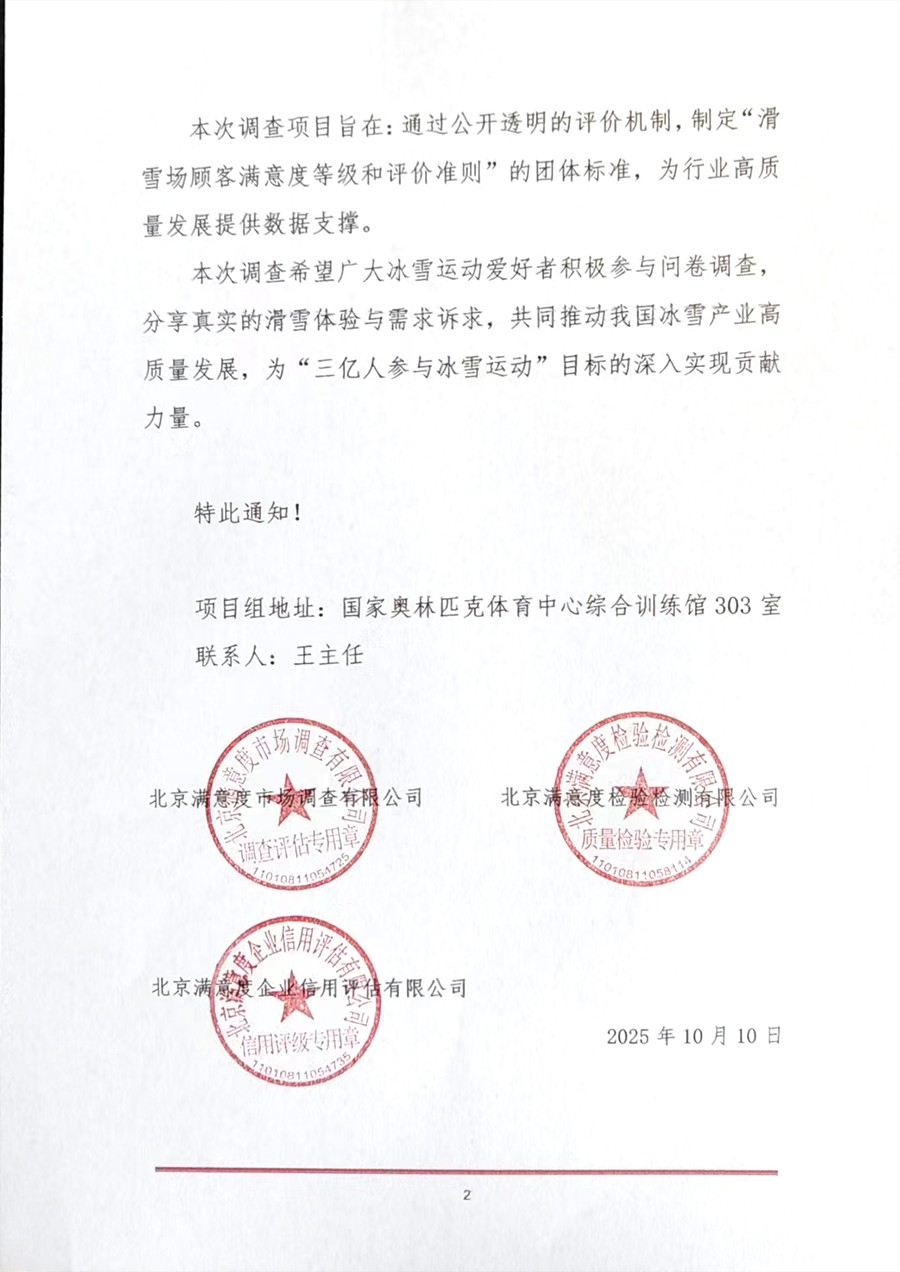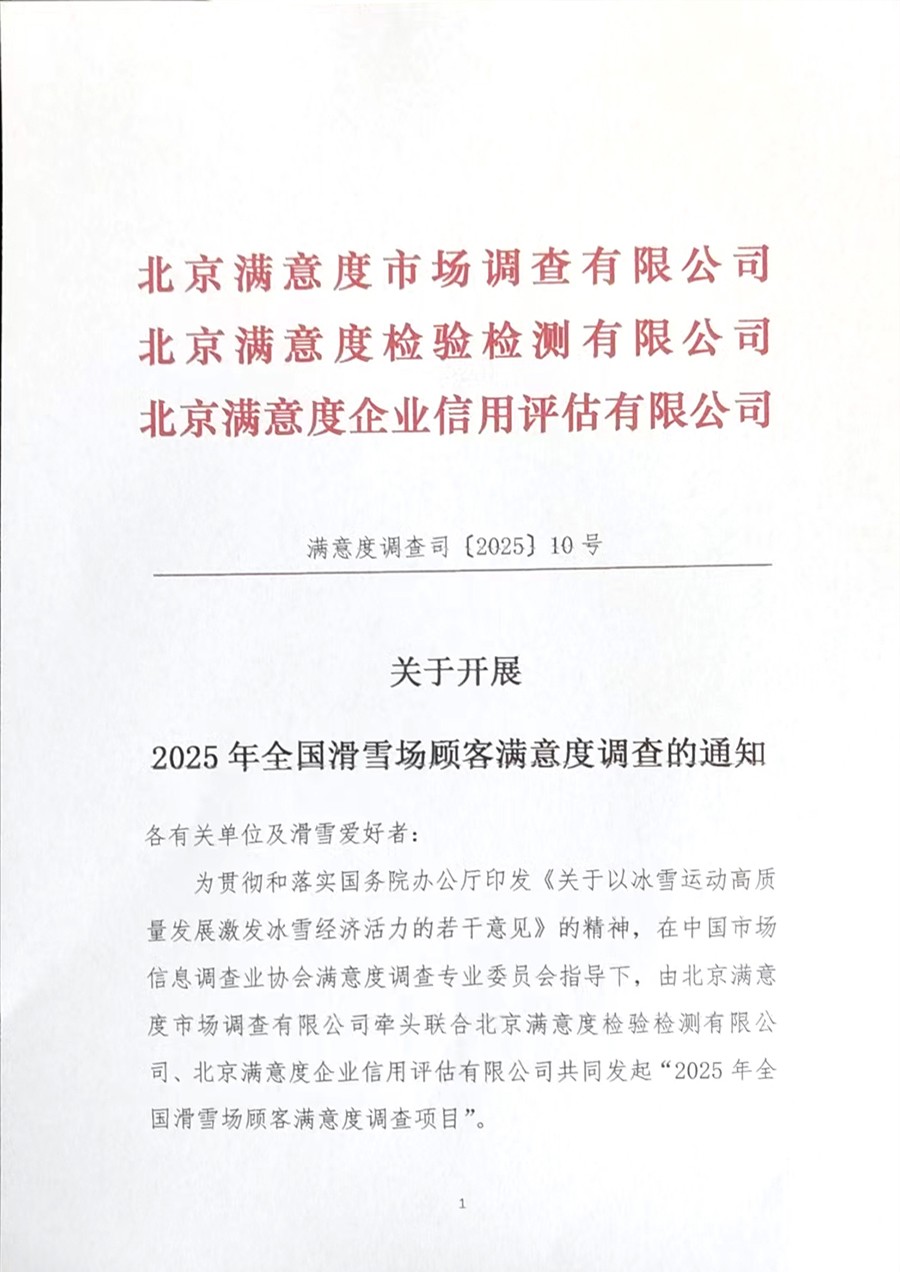 随着冰雪运动持续升温,我国正在加速从“冰雪旅游大国”向“冰雪旅游强国”转型。2024-2025雪季全国滑雪人次突破2800万,其中家庭客群占比首次超过50%,显示出滑雪正从专业圈层向大众消费转型。为科学评估国内滑雪场运营服务水平,精准把握消费者需求变化、推动冰雪产业高质量发展,在中国市场调查业协会满意度调查专业委员会指导下,由北京满意度市场调查有限公司牵头联合北京满意度检验检测有限公司、北京满意度企业信用评估有限公司共同发起的“2025年全国滑雪场顾客满意度调查项目”于今日正式启动。
